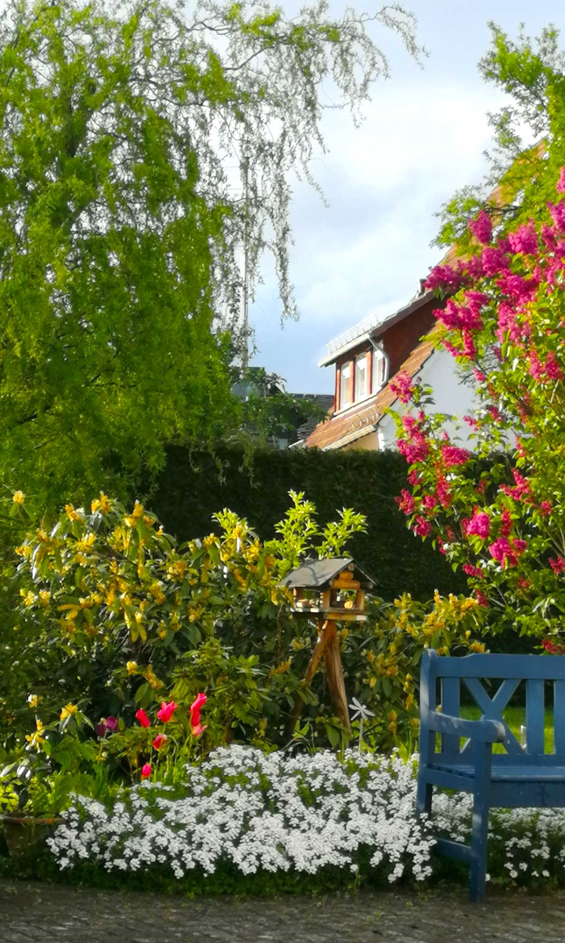 Der Eingang befindet sich auf der Rückseite des Hauses, die zum Garten hin gelegen ist. Vor dem Haus und auf dem Grundstück gibt es kostenlose Parkmöglichkeiten und auch Stellplatz für Zweiräder. Gerne können Sie den kleinen Garten mitbenutzen. Für Raucher haben wir ein Plätzchen mit Sitzbank unter dem überdachten Eingangsbereich mit Blick auf den Garten hinter dem Haus.